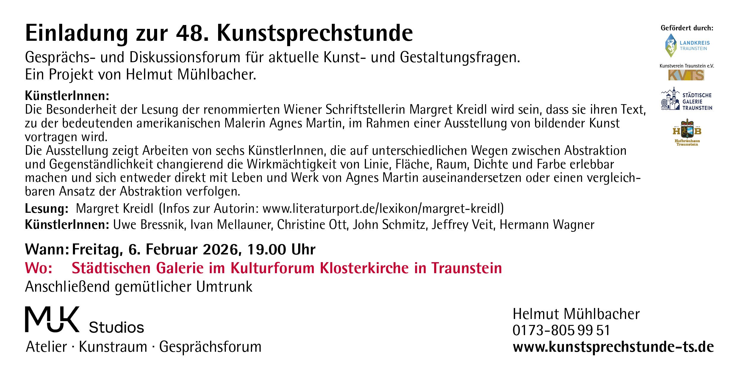 Herr Rackl bietet den Mitgliedern des Kunstvereins Traunstein e.V. Ausstellungsmöglichkeiten in der Galerie CHIEMSEEBRUCKgalerie.Zu den Details