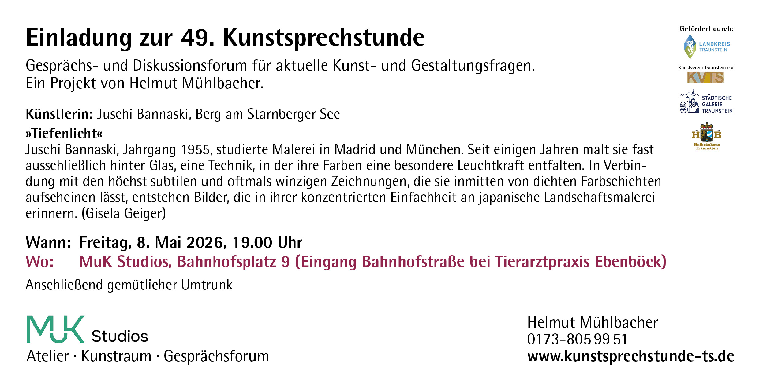 Herr Rackl bietet den Mitgliedern des Kunstvereins Traunstein e.V. Ausstellungsmöglichkeiten in der Galerie CHIEMSEEBRUCKgalerie.Zu den Details